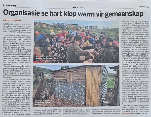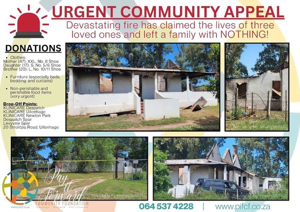 The Pay It Forward Community Foundation played a vital role in supporting the Uitenhage flood crisis, receiving donations from numerous sources and mobilizing volunteers to aid those affected. We're committed to continuing this effort, providing essential items like food parcels, blankets, and clothing to those who need it most. You can still make a positive impact - join us in our mission to support the flood victims!